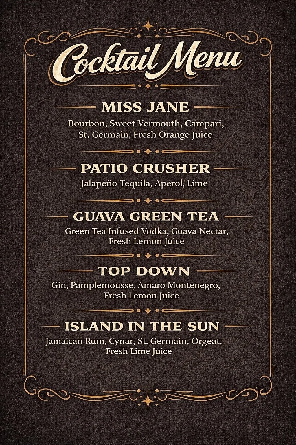 We don’t believe in static drink menus. We’re always experimenting, tasting, and building something new. Here’s what’s currently living on our bar — but check back, because it won’t stay the same for long.